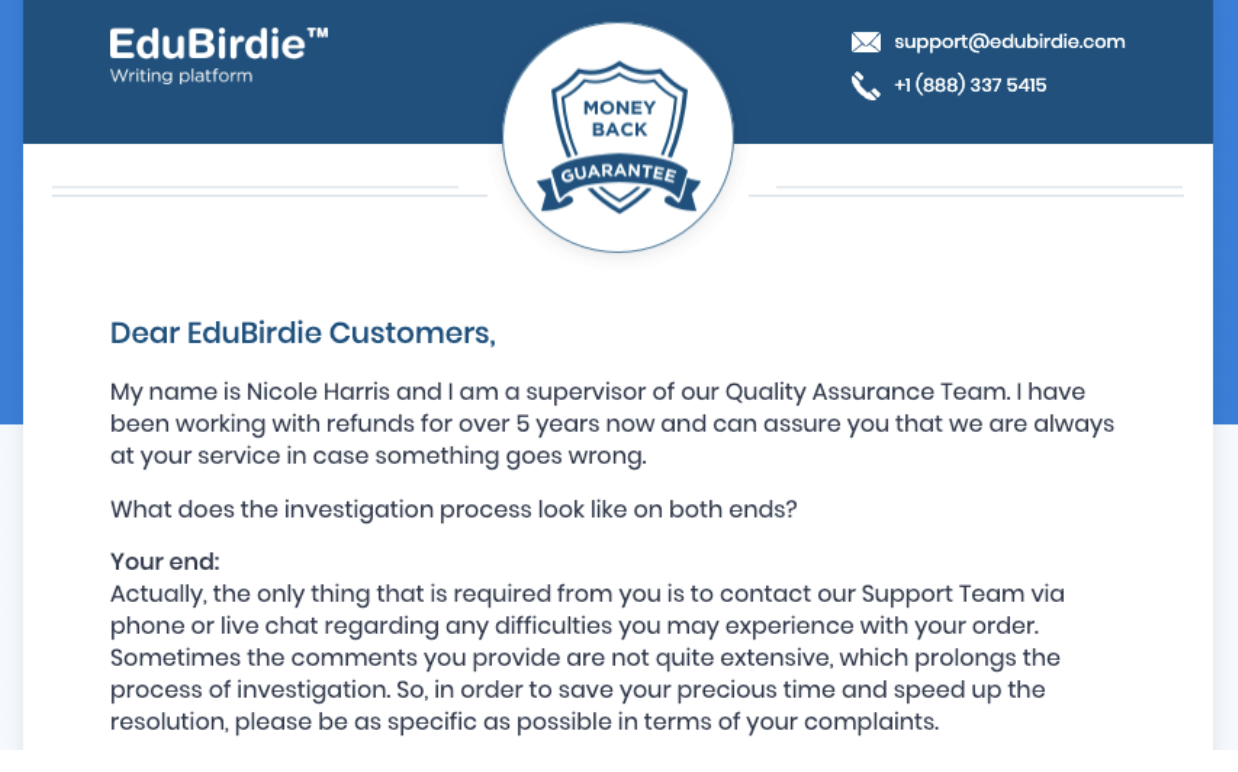On their website, they mention a “Money Back Guarantee.” Sounds reassuring, right? But the actual wording is buried in the policy page, and it’s basically a giant loophole. The key phrase? “The Company may, at its sole discretion, provide a refund in the form of credits toward future orders.” (Edubirdie Refund Policy, retrieved June 2025). That’s corporate-speak for: “We’re not giving you your cash back. Ever.”
