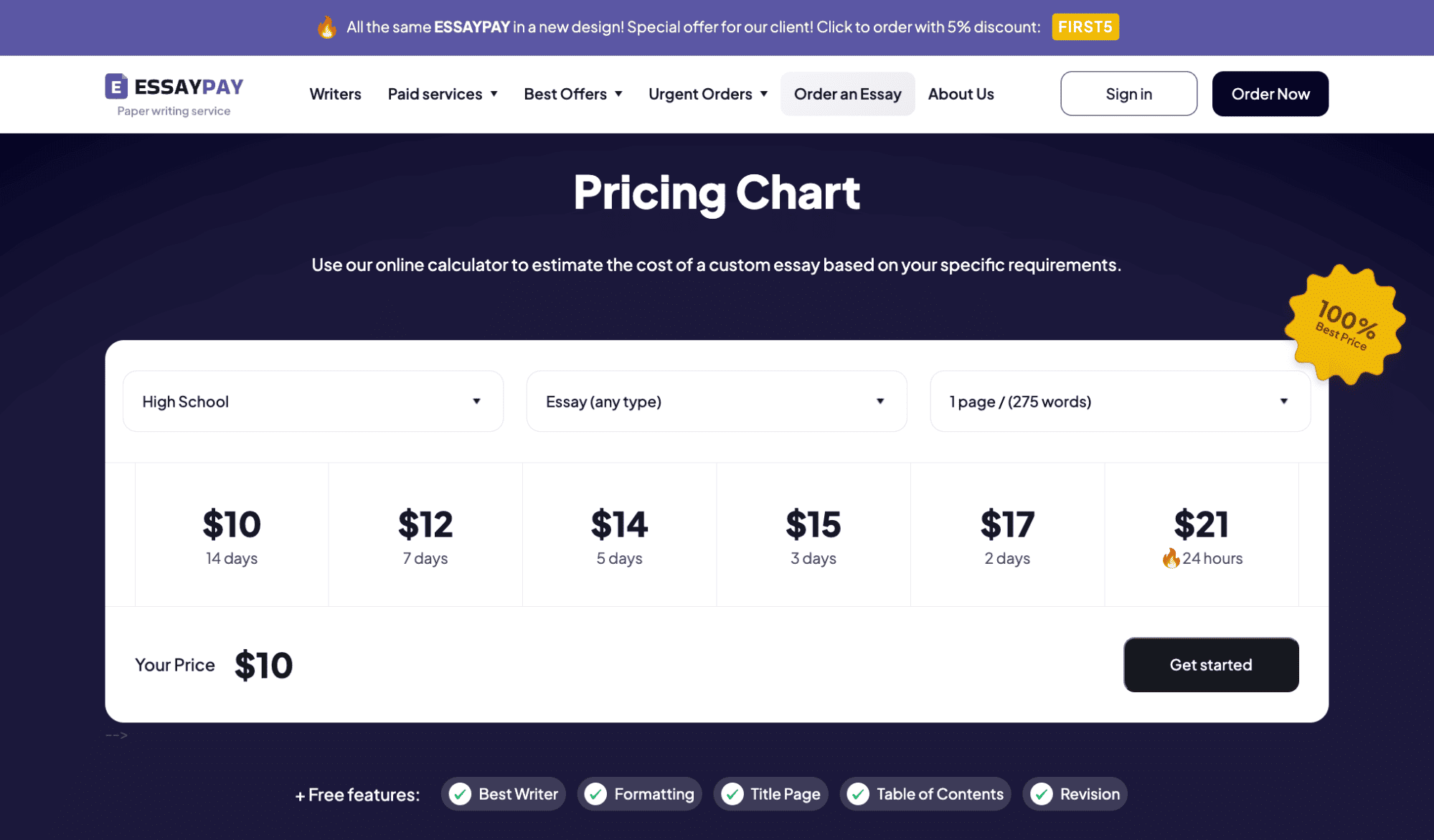 EssayPay is transparent in its pricing structure and they strive to provide a clear breakdown of the costs associated with each order. The final price of the paper is no different from what you see on the screen when you place your order. You can find out the cost by using the calculator on the homepage of Essaypay.com.