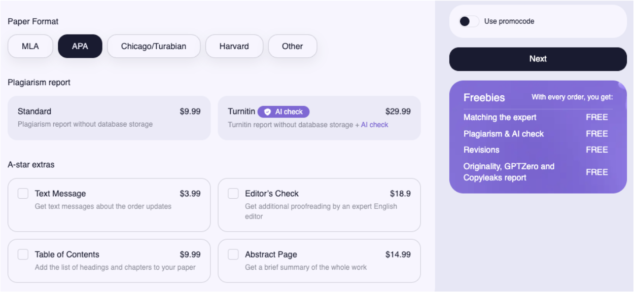 They offer things like VIP support and plagiarism reports. VIP just adds SMS notifications. Plagiarism reports are similar to Turnitin but at a steep cost. Honestly, I found these extra features unnecessary and overpriced.