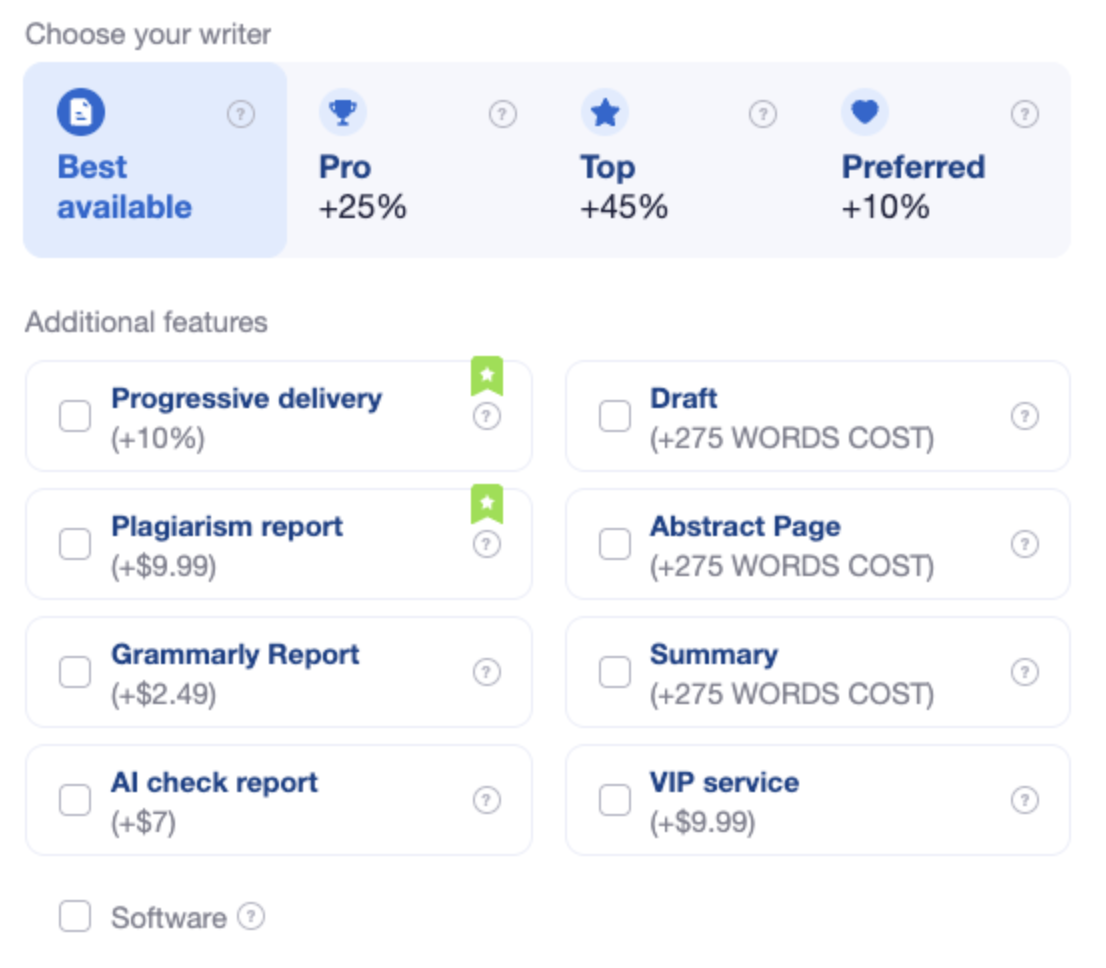 I remember sitting there, staring at the screen, debating. Do I really need a “pro” writer for an extra third of the price? Shouldn’t every writer be professional? And why on earth would I pay extra for proof my paper isn’t plagiarized? That should be standard, right? Still, I decided to keep it simple. I skipped all the extras, told myself, “basic package should be enough,” and paid up.