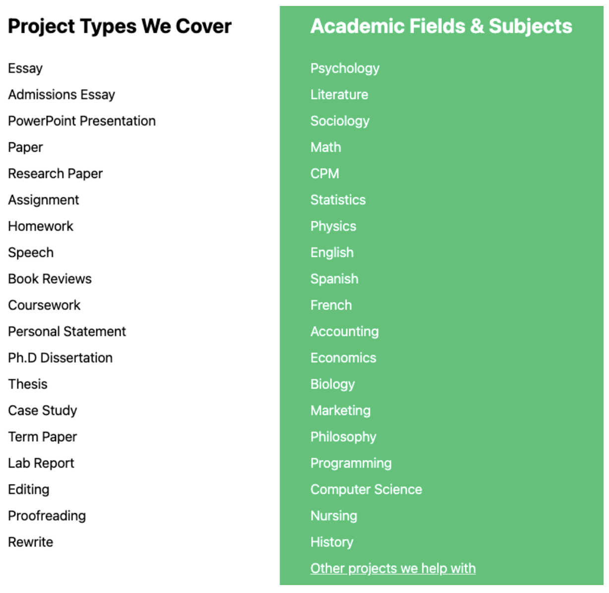 On paper, Studybay claims to cover everything: essays, research papers, lab reports, presentations, even CVs. Scroll through their site and you’ll see over a hundred academic subjects listed, from philosophy to nursing to computer science. It’s the kind of catalog that makes you think, “Wow, no matter what I need, they’ve got me.”